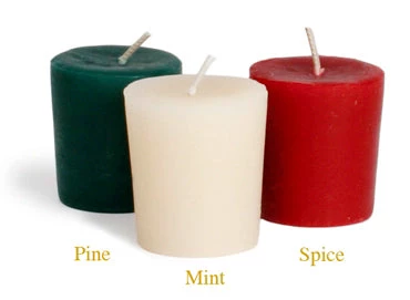 Our popular, pure beeswax votives specially scented and dyed for the holidays. Scented with pure essential oils, as always. For best results, burn votives in a container that fits close around the diameter of the candle.