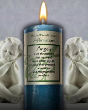 A sky blue candle with a sweet floral blend, 2 x4 pillar with a 40 hour burn time. Whether you need assistance from a heavenly Angel or an Angel incarnate on this earth, our Angel Affirmation candle will bring you the gentle confidence that the help you desire is here. Affirmation: I see the miracles that my angels work within my life. I feel their presence around me and recognize them in others.