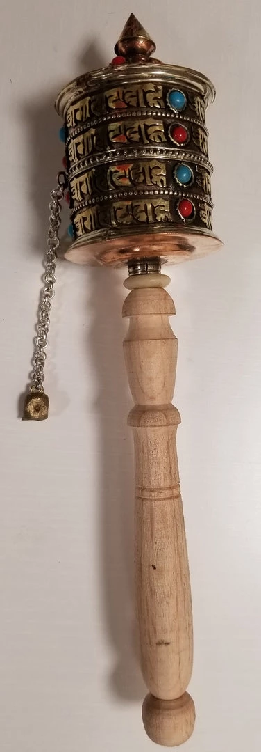 Prayer wheels are used to accumulate wisdom and merit and to purify negativity. The practitioner most often spins the wheel clockwise, as the direction in which the mantras are written is that of the movement of the sun across the sky. The prayer wheel is affixed with a chain terminating in a metal weight allowing it to be spun by a slight rotation of the wrist. Prayer Wheels are a manifestation of the Compassion Buddha’s holy speech.