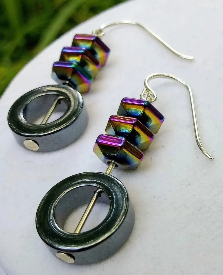 These earrings will keep you grounded but never boring! Hematite circle on the bottom is topped with three rainbow hematite angled saucer-like beads suspended on Sterling Silver Wire. They are each dangling from a Sterling Silver French Hook. Each dangle is approximately 1 inch long with the entire earring dangling approximately 1 1/2 inches.