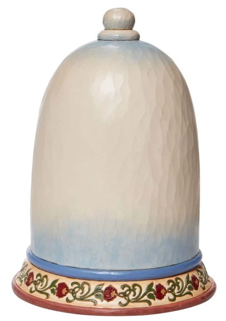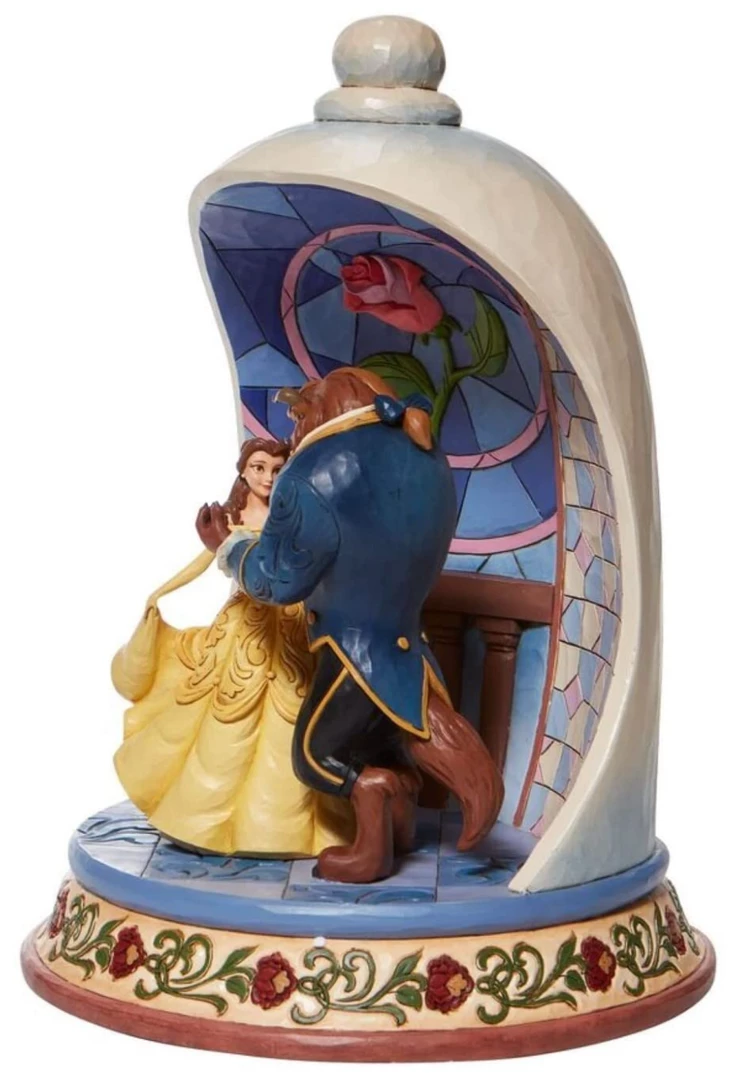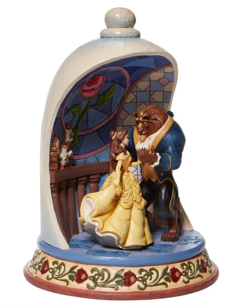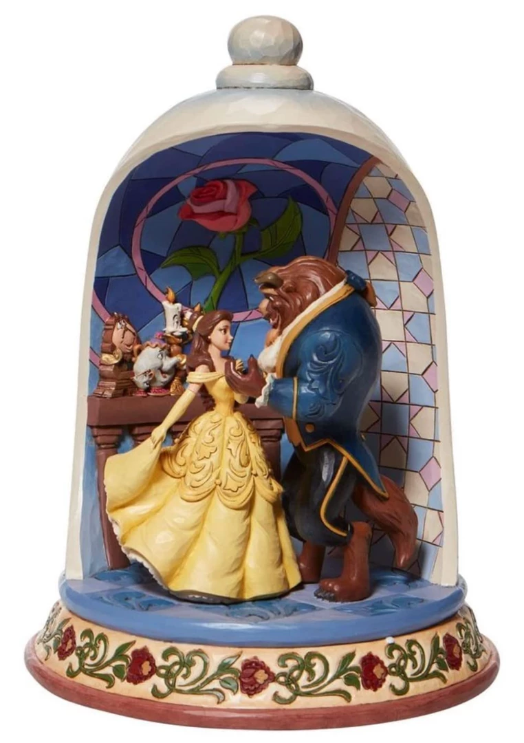 This Jim Shore hand-painted diorama figurine helps celebrate the 30th anniversary of the legendary romance of Belle and the Beast. Very enthusiastic Lumiere, Cogsworth and Mrs. Potts watch as Belle and the Beast share a moonlight waltz and loving gaze.