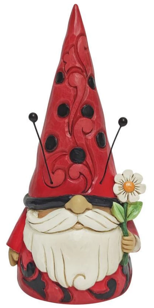 For centuries, gnomes have been symbols of good luck. Often placed near the home, they are thought to provide protection with their delightful charm. This Jim Shore gnome holds a flower in his hand and blends into the garden, dressed as a lady bug.