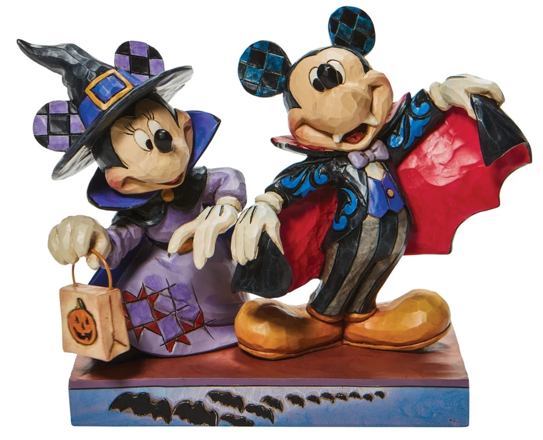 Disney’s Mickey and Minnie don some spooky suits for the sake of Halloween. Mickey dresses as a vampire while Minnie transforms into a candy craving witch in this Jim Shore design.