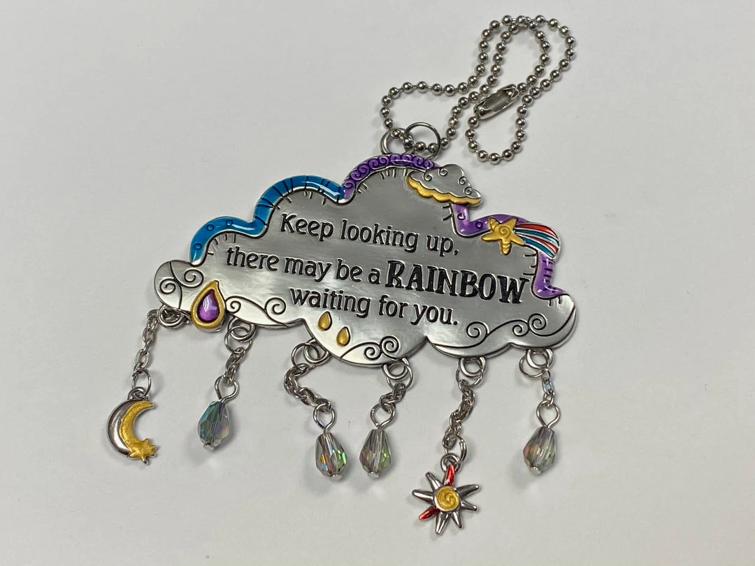 A beautiful cloud design to accompany you on your travels. This car charm has the saying Keep Looking Up, There May Be A Rainbow Waiting For You with charms dangling from the center. Makes a great gift for a new car, friends, teachers, or co-workers.