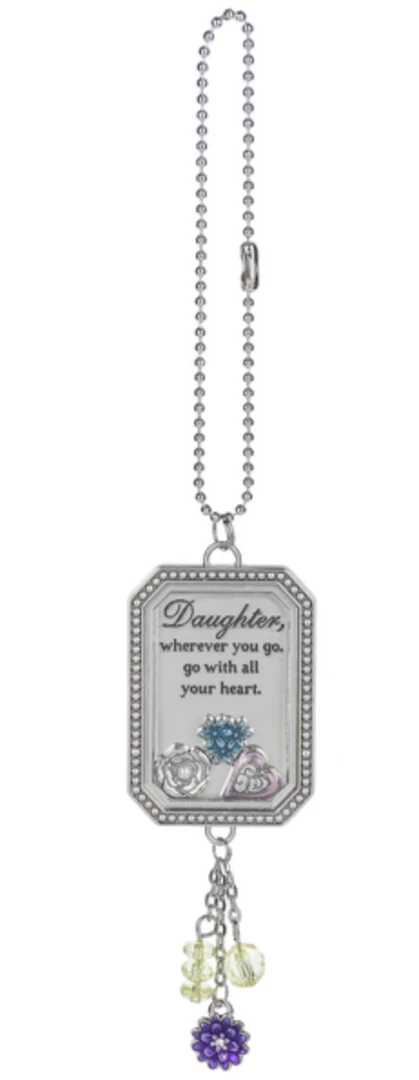 A beautiful design to accompany you on your travels, this car charm is a lovely square featuring dangling charms from the center with the saying “Daughter, wherever you go, go with all your heart.” Makes a great gift for a new car, friends, teachers, or co-workers.