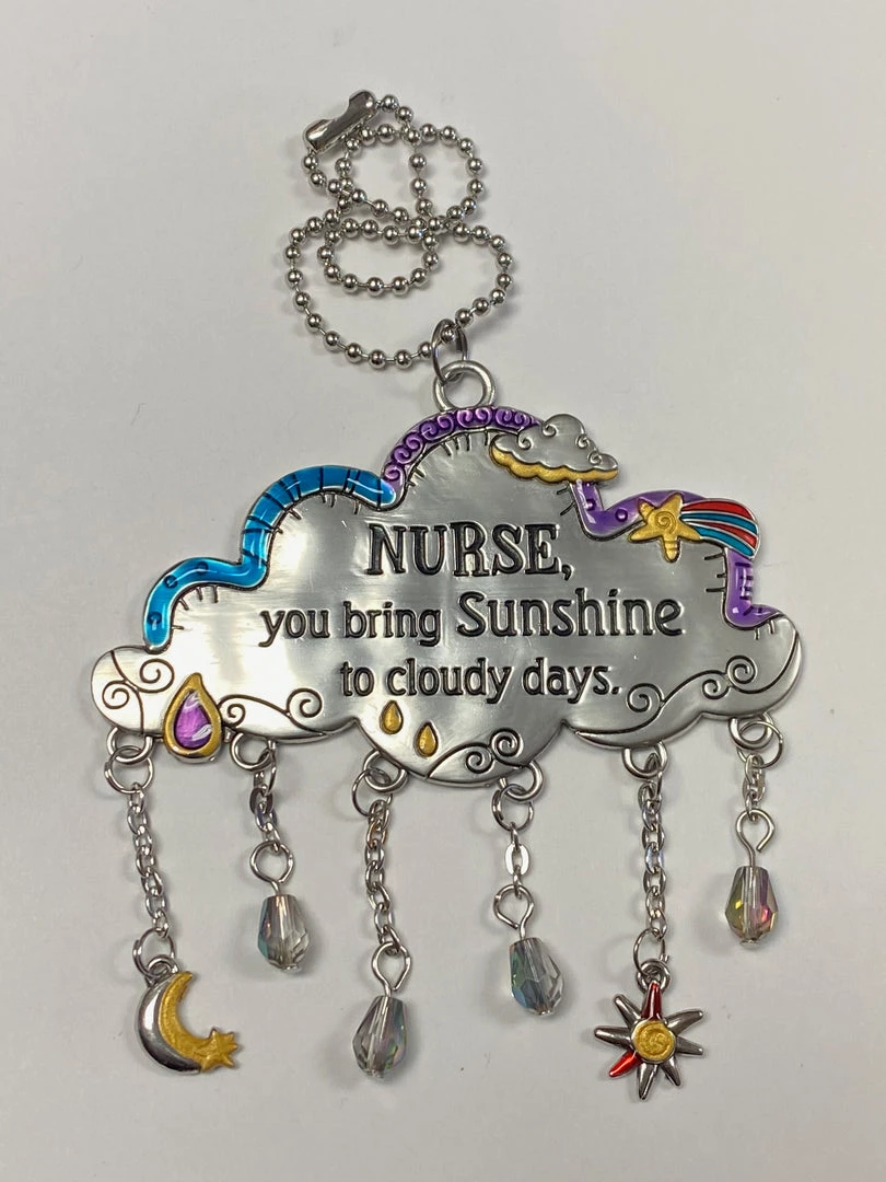 A beautiful cloud design to accompany you on your travels. This car charm has the saying Nurse You Bring Sunshine to Cloudy Days with charms dangling from the center. Makes a great gift for a new car, friends, teachers, or co-workers.