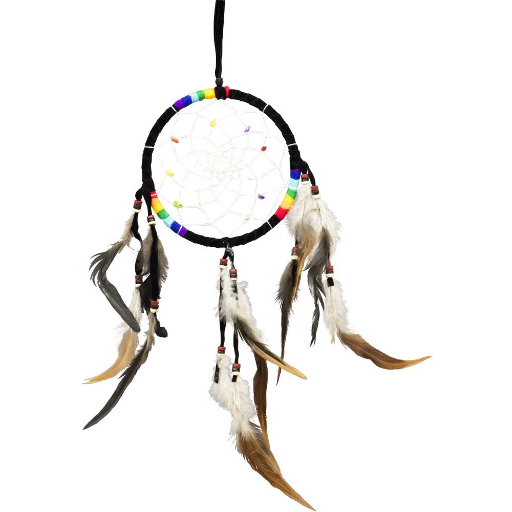 Seven stones representing the colors of the chakras have been woven into the web of this lovely dreamcatcher. Matching bands of colored faux suede have been wrapped in alternating bands to form the rim. Black strands with natural feathers and accent beads complete the design. Diameter in Inches: 5.5