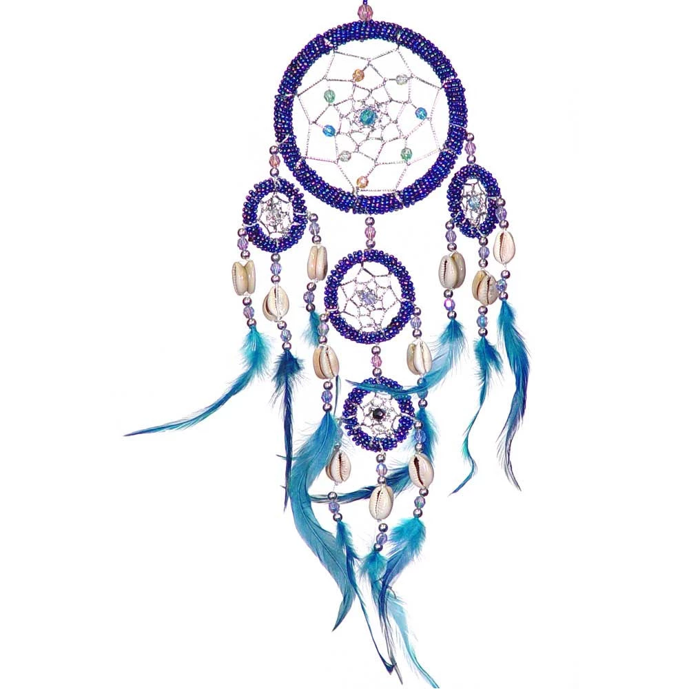 This beautiful dream catcher rings have been made with iridescent blue beads. Adding extra color and movement to the web are tiny shells and turquoise feathers which hang from each of the four smaller webs. 17″L; diameter 3.5″