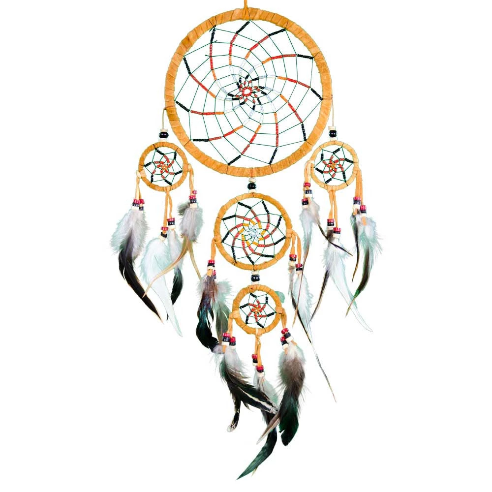 This unusual dream catcher has been made with tightly wrapped mustard colored faux suede. Each of the catchers five webs feature a multi-color beaded spiraling vortex. Natural feathers flow from beaded strands adding texture and movement to this vibrant dream catcher. Diameter in Inches: 6.5