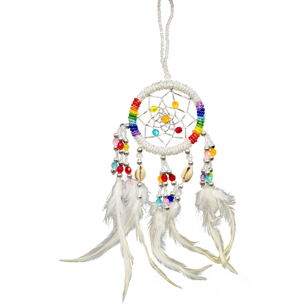 This stunning dream catcher is made from white iridescent beads, flanked on each side by bands of colored beads which represent the colors of the seven chakras. White feathers flow from vibrant beaded strands, with alternating strands of sea shells, to add extra color, texture and movement to the dreamcatcher. Diameter in Inches: 2.5