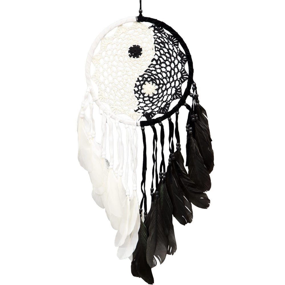 The center of this delightful black and white dreamcatcher has been woven into the symbol of the Yin Yang. Matching beads and feathers hang from the rim. Hang this dreamcatcher anywhere balance is needed. Diameter 8″ Made in Bali.