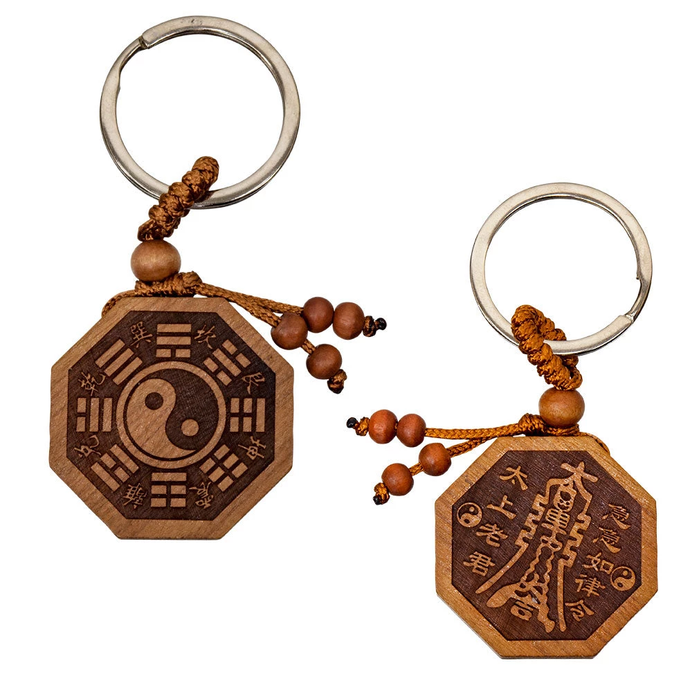 This handy little key chain is laser cut from jujube wood and embellished on both sides. With a detailed Yin Yang and matching I-Ching symbols on one side and a Daoism charm on the other, take the meaning of balance with you everywhere you go.