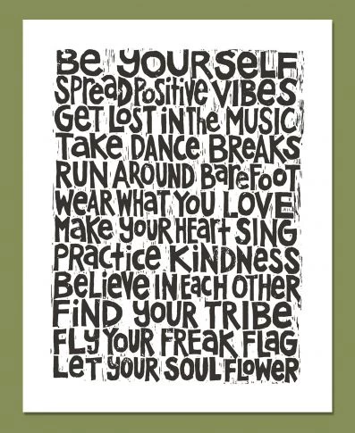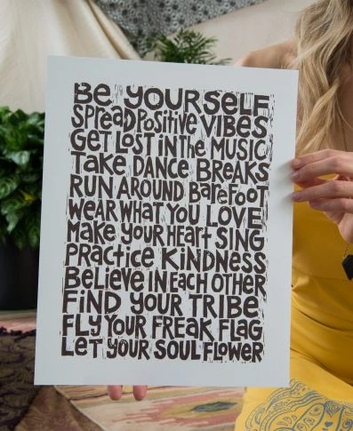 This manifesto art print will teach you to be everything that you already are. Inspired by our own personal manifesto, and originally carved and hand printed, this art print reads: ‘be yourself ~ spread positive vibes ~ get lost in the music ~ take dance breaks ~ run around barefoot ~ wear what you love ~ make your heart sing ~ practice kindness ~ believe in each other ~ find your tribe ~ fly your freak flag ~ let your soulflower.’ Perfect for your home, office or anywhere you need a little extra inspiration. Digitally printed on a texured, heavyweight paper. 100% recycled. 11 x 14 inches.