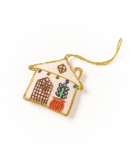 Our Larissa Plush Ornament Collection features soft, cheerful designs brought to life by master artisans in New Delhi. Ornate embellishment is a proud cultural tradition in India, an art form cultivated and passed down from one generation to the next. This handcrafted felt plush ornament features a cozy home design with vibrant embellishment, gold metallic trim, and gold metallic hanging loop. Global Fair Trade handmade gift by artisans in India. 2.75″L x 3″W