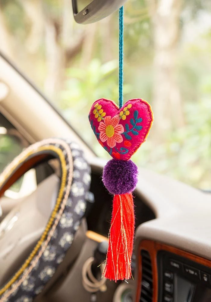 Tassels Tie-Ons make everything more fun… you can literally tie them anywhere! They are embroidered on both sides with pom poms & tinsel tassels and look SO cute in your car, on your purse, as a keychain or even hung on your wall! Bright colored embroidered tassels with rope tie, measures 13.5″ length.