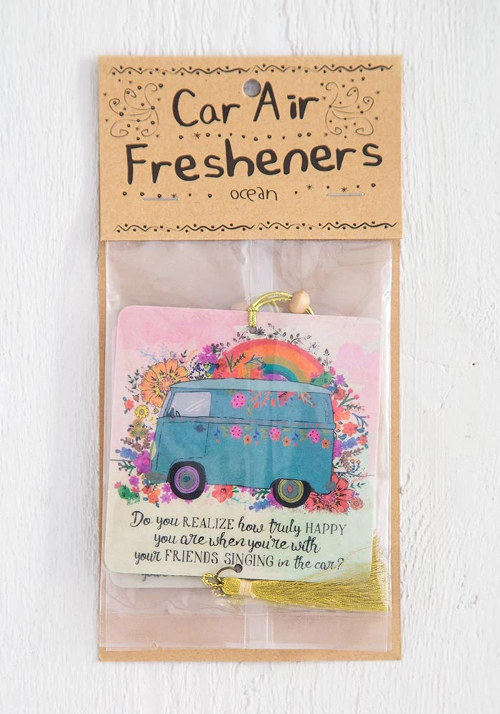 Perfect for hanging in the car, locker, bathroom, bags and more! Set of 3, features wooden bead on an elastic hanger for easy placement. Double-sided; Dimensions: Approximately 3.5in diameter.