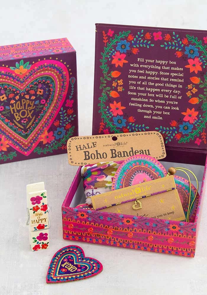 A Happy Box is the Best Gift Ever! We took 6 of our most popular “little treasures” and packaged them inside a decorated keepsake Happy Box! The box itself is the best part! Each box differs a little but contains things like Boho Bandeaus, Air Fresheners, Bracelets, Happy Clips, Tiny Tin Happy Notes and phone pockets.