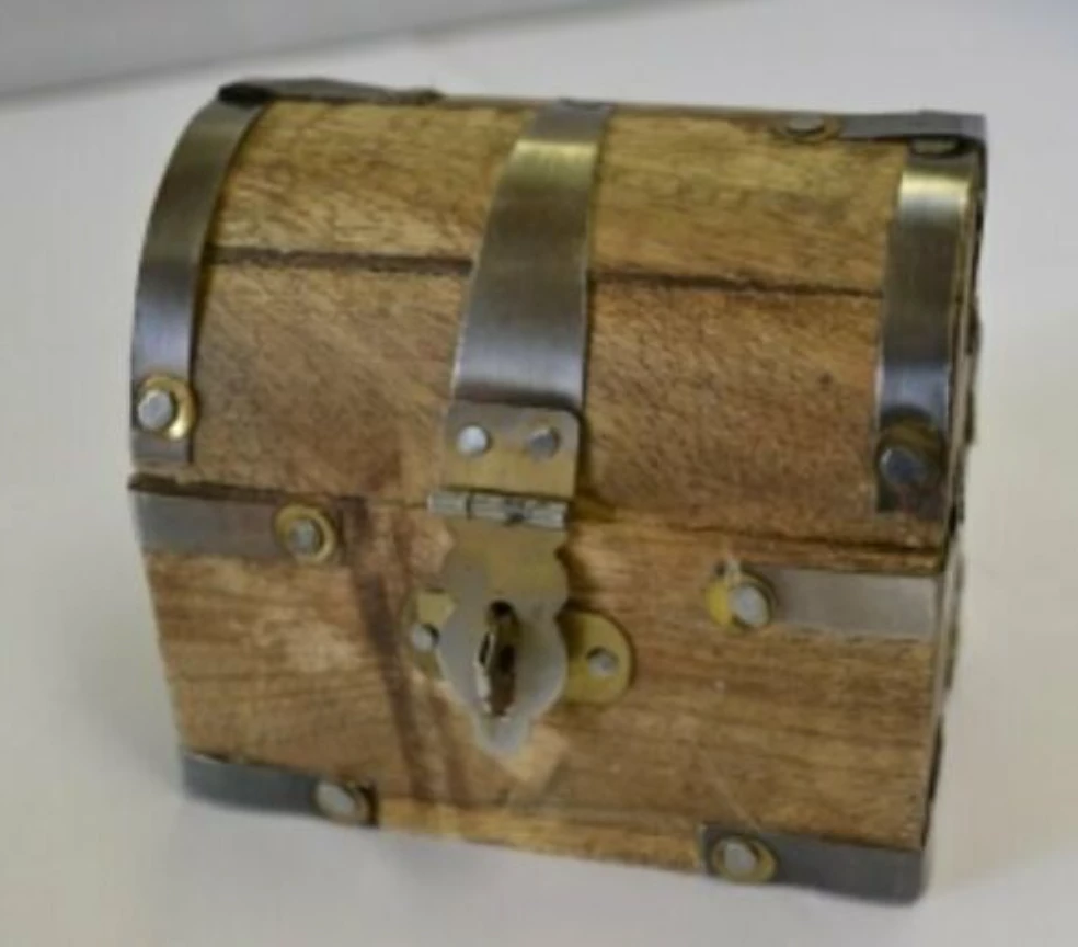 Old world design makes this antique treasure chest perfect for trinkets, jewelry, stones, treasure, and more. It measures 3″ L x 2.75″H with inner dimensions of 2 3/8″W, 1 1/4″H, 1 3/8″L. This wooden chest has antique metal finishing touches.