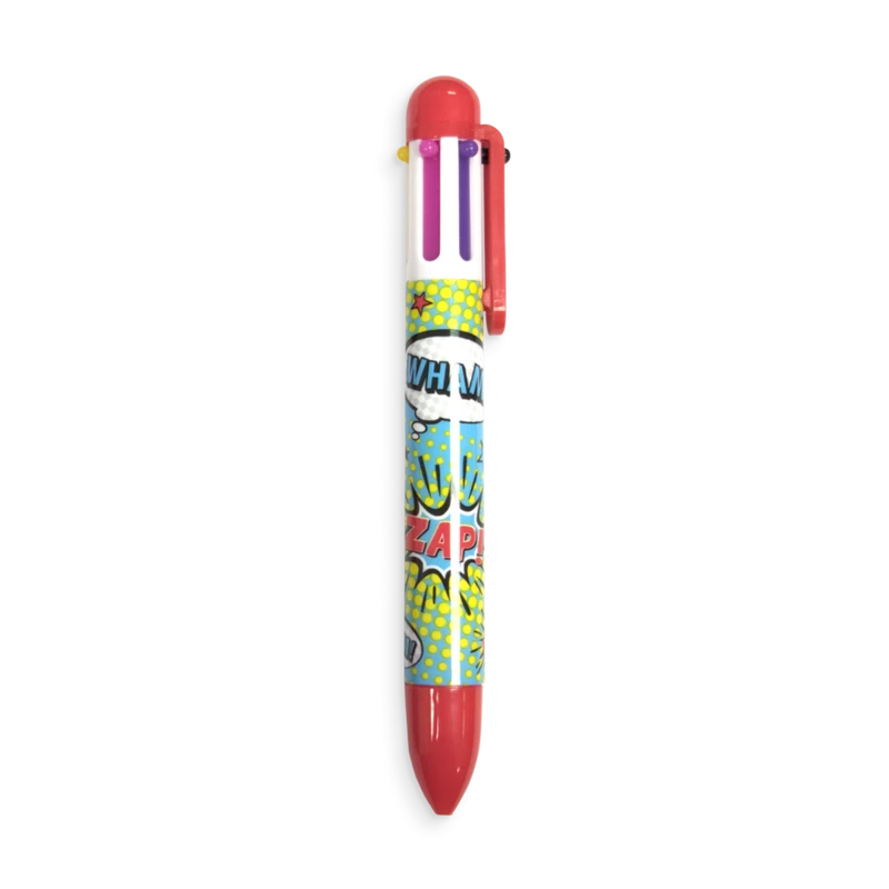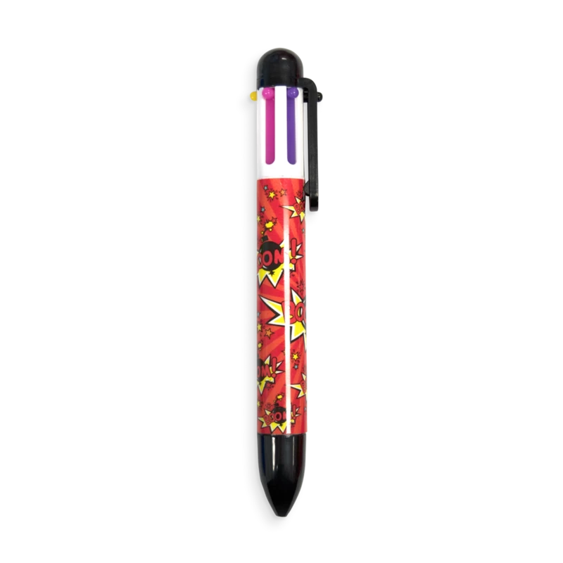 Truth, Justice and really cool colored ink! Write, draw and create with 6 different colors in one pen with the Comic Attack 6 Click Pen. With 6 colored inks to choose from you’ll be the hero of your school with your new multi colored pen. Take color coordinated notes, make colored highlights in textbooks, add color to your ink drawings and choose the best color for the paper you’re writing on. It’s all just a click away. Colors include Blue, Green, Yellow, Red, Purple and Black. Comic Attack 6 Click Pens come in 4 different styles each with their own unique designs. Choose from Red, Green, Blue and Black. Choose from 4 different styles or get all 4!