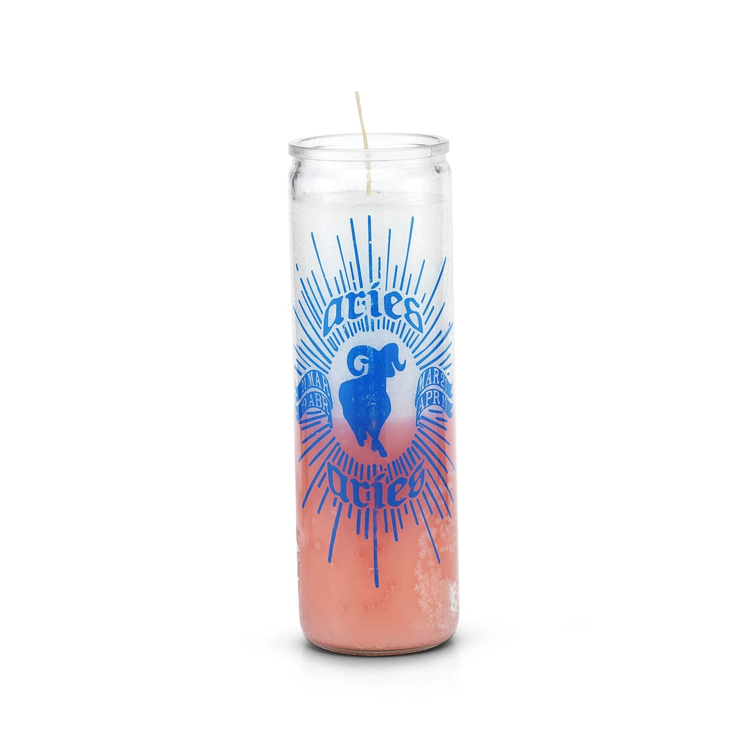 Burn this 7 Day Aries astrological candle to stimulate life-giving energy and ambition. Burning time of approximately 140 hours; measures 2 1/2″ Wide and 8 1/4″ Tall. Made of 100% Paraffin Wax in imprinted glass pillar holder.
