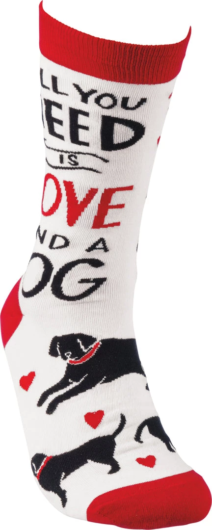 Colorfully printed socks lending “All You Need Is Love And A Dog” with dog and heart designs. Cotton, nylon, spandex. One size fits most.