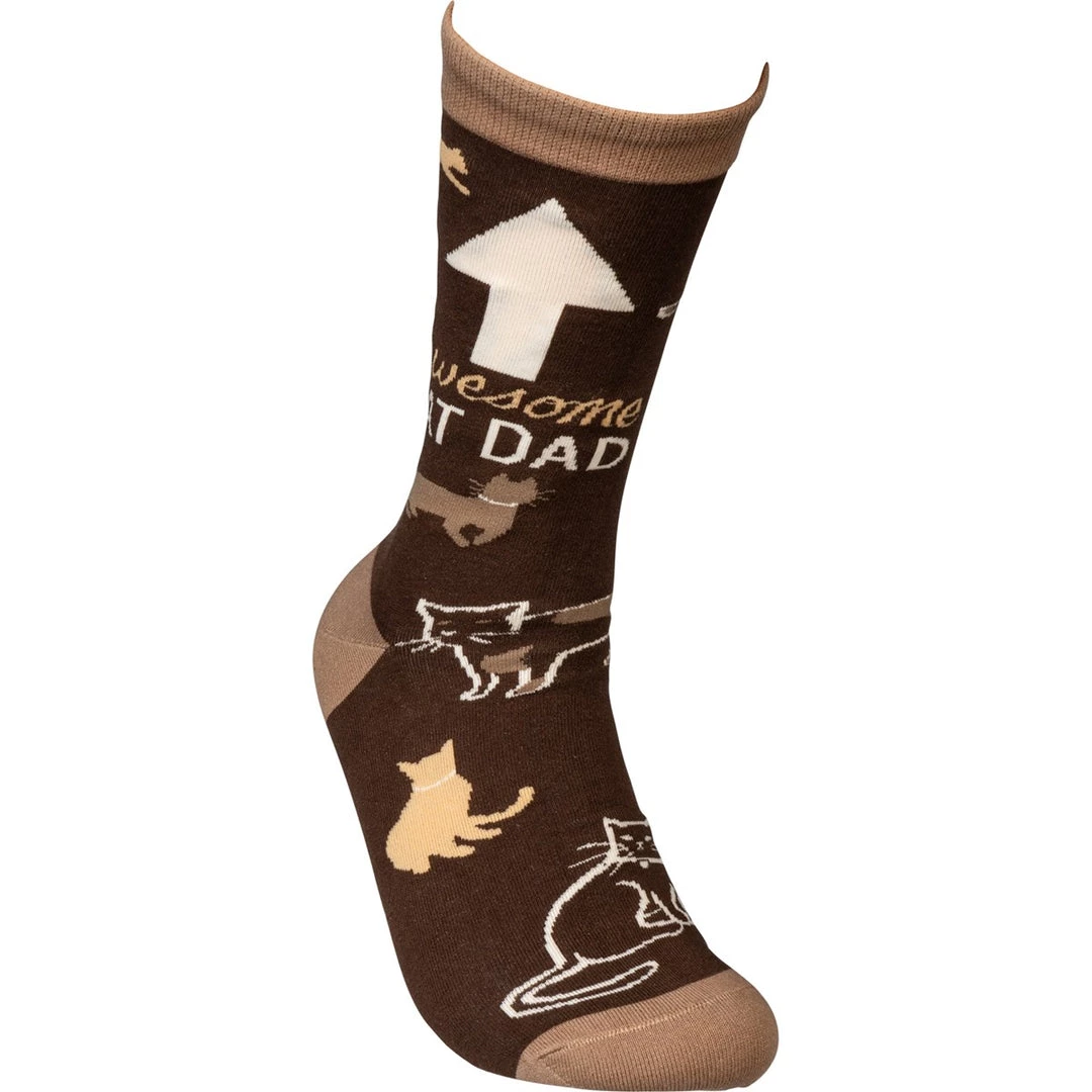 A pair of socks featuring “Awesome Cat Dad” sentiment with cat pattern. One size fits most. Cotton, nylon, spandex. One size fits most.