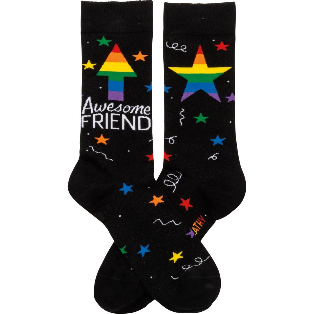 A pair of socks featuring “Awesome Friend” sentiment with rainbow stars and squiggles pattern. One size fits most. Cotton, nylon, spandex. One size fits most.