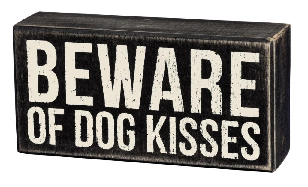 A classic black and white wooden box sign featuring a distressed “Beware Of Dog Kisses” sentiment. Easy to hang or can free-stand alone.