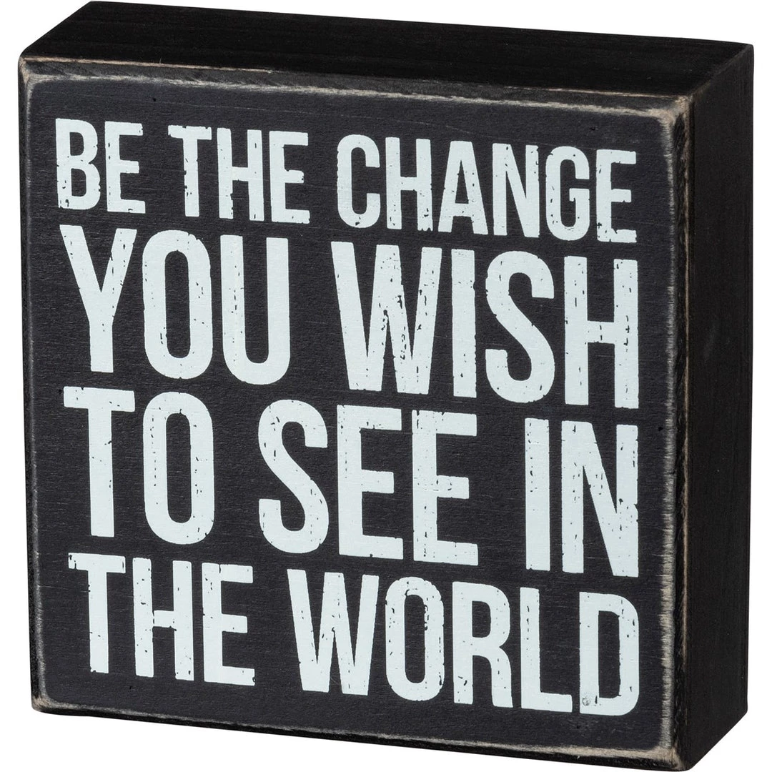 A wooden box sign featuring a “Be The Change You Wish To See In The World” sentiment. Easy to hang or can free-stand alone. 5″ x 5″ x 1.75″