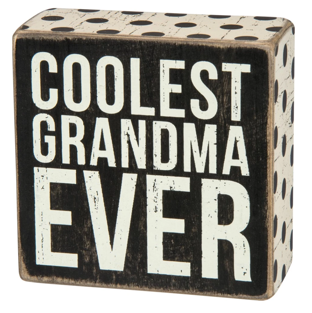 A classic black and white wooden box sign featuring a distressed “Coolest Grandma Ever” sentiment with polka dot trim designs. Easy to hang or can free-stand alone. 4″ x 4″