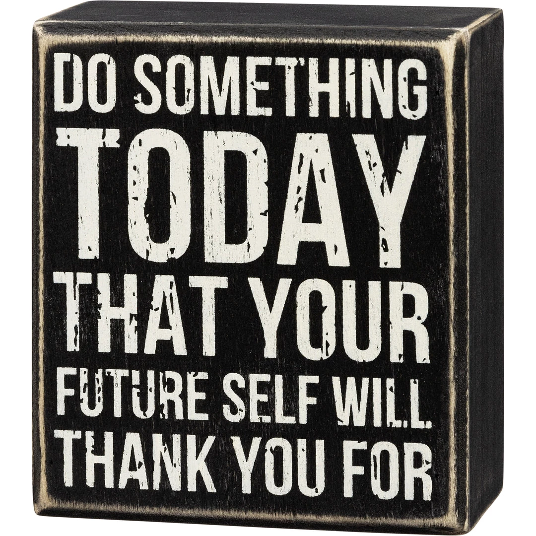 A classic wooden box sign featuring a “Do Something Today That Your Future Self Will Thank You For” sentiment. Easy to hang or can free-stand alone.