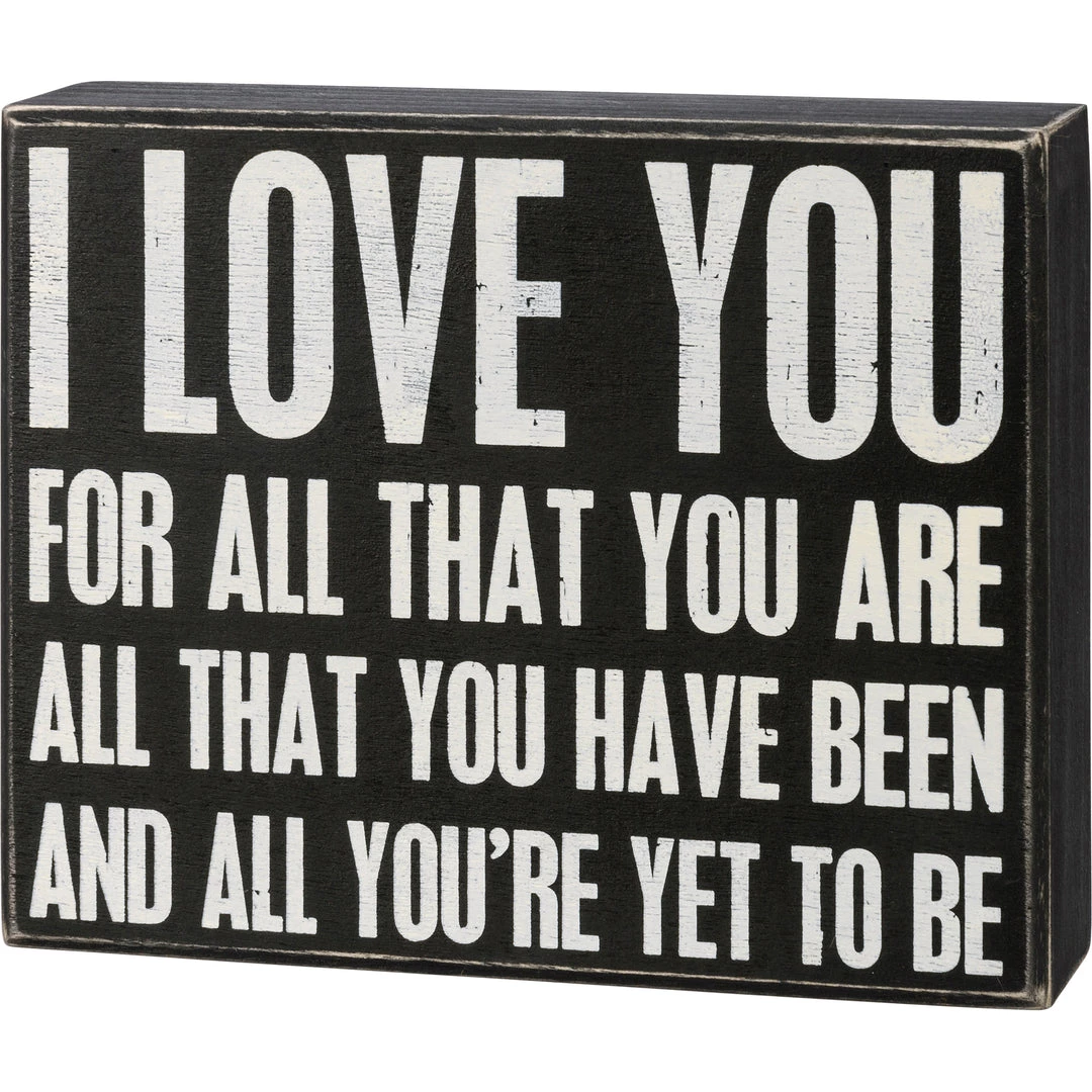 A classic black and white wooden box sign featuring a distressed “I Love You For All That You Are All That You Have Been And All You’re Yet To Be” sentiment. Easy to hang or can free-stand alone.
