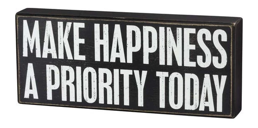 A classic black and white box sign featuring a distressed “Make Happiness A Priority Today” sentiment. Easy to hang or can free-stand alone. 12″ x 5″ x 1.75″