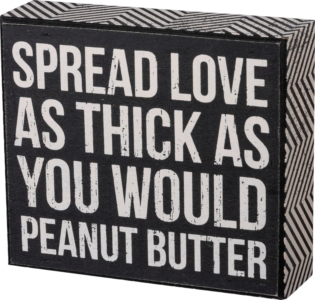 Classic and timeless, a black and white wooden box sign featuring a distressed “Spread Love As Thick As You Would Peanut Butter” sentiment. Easy to hang or can free-stand alone. 6″ x 5.25″ x 1.75″
