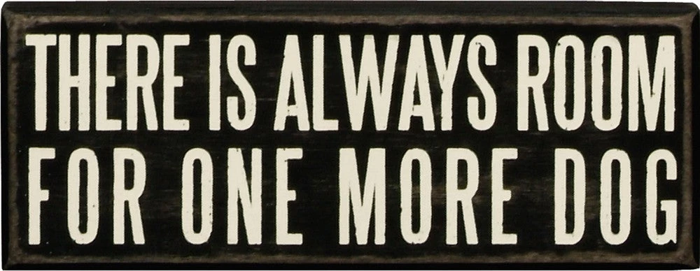 A classic black and white wooden box sign featuring a distressed “There Is Always Room For One More Dog” sentiment. Easy to hang or can free-stand alone. 8″ x 3″ x 1.75″