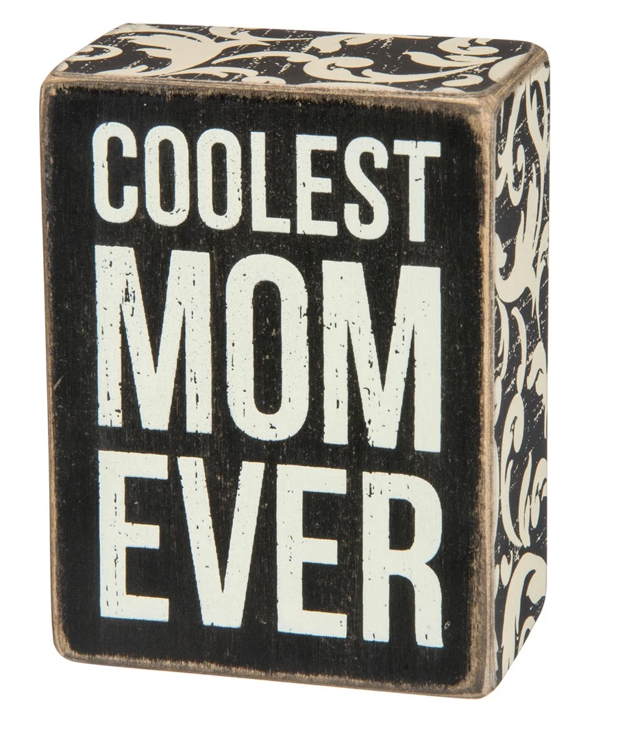 A classic black and white wooden box sign featuring a distressed “Coolest Mom Ever” sentiment with floral abstract trim designs. Easy to hang or can free-stand alone. 3″ x 4″