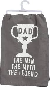 A cotton dish towel lending a distressed “Dad – The Man – The Myth – The Legend” sentiment with trophy and star designs. Complements well with coordinating design pieces for a cohesive display or gift set. Cotton, machine-washable, measures 28″ x 28″. Sold individually.