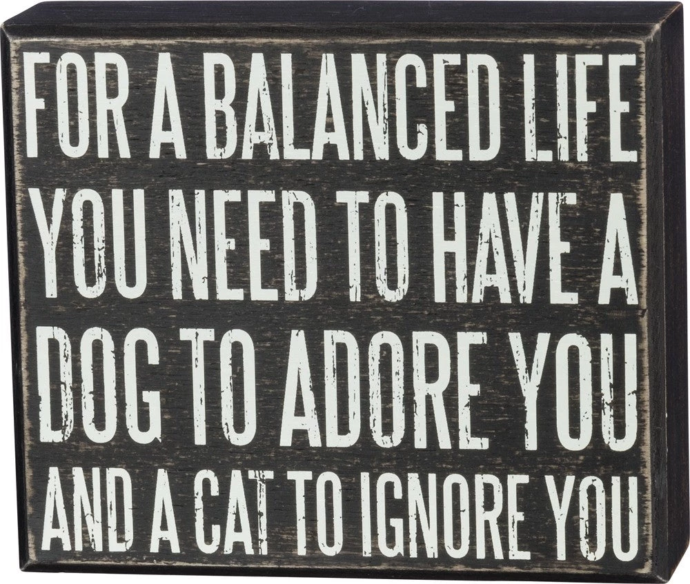 A classic black and white wooden box sign featuring a distressed “For A Balanced Life You Need To Have A Dog To Adore You And A Cat To Ignore You” sentiment. Easy to hang or can free-stand alone.