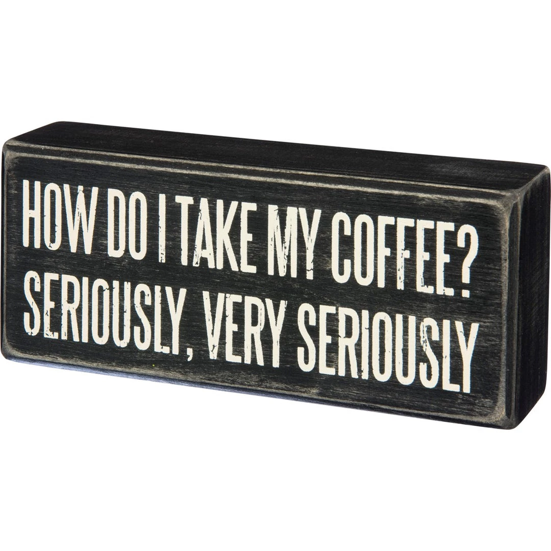 A classic black and white wooden box sign featuring a distressed “How Do I Take My Coffee? Seriously, Very Seriously” sentiment. 6″ x 2.50″ x 1.75″