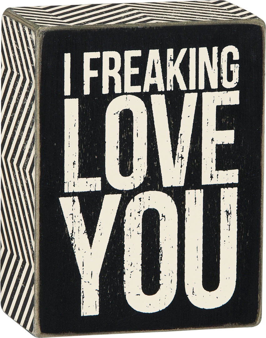 A classic black and white wooden box sign featuring a distressed “I Freaking Love You.” sentiment with zigzag print trim designs. Easy to hang or can free-stand alone. 3″ x 4″ x 1.75″