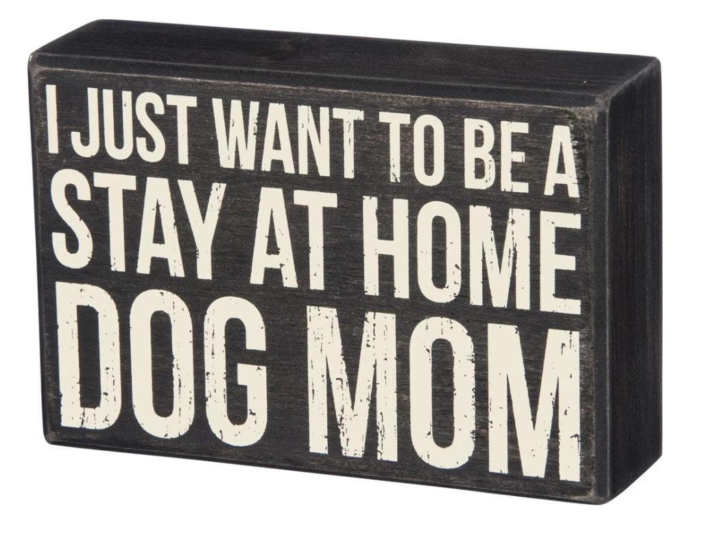 A classic black and white wooden box sign featuring a distressed “I Just Want To Be A Stay At Home Dog Mom” sentiment. Complements well with coordinating design pieces or existing décor. Easy to hang or can free-stand alone.