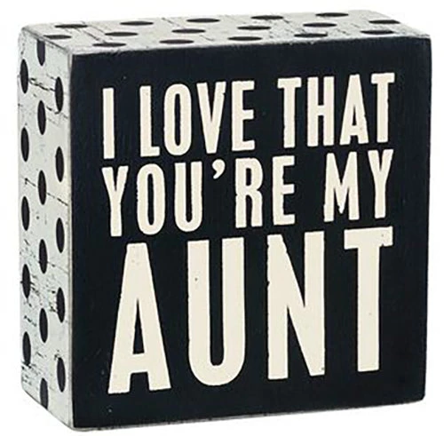 A classic black and white wooden box sign featuring a distressed “I Love That You’re My Aunt” sentiment with polka dot trim designs. Easy to hang or can free-stand alone.e.