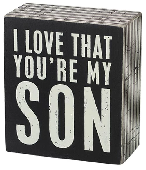 A classic black and white wooden box sign featuring a distressed “I Love That You’re My Son” sentiment with striped trim designs. Easy to hang or can free-stand alone.