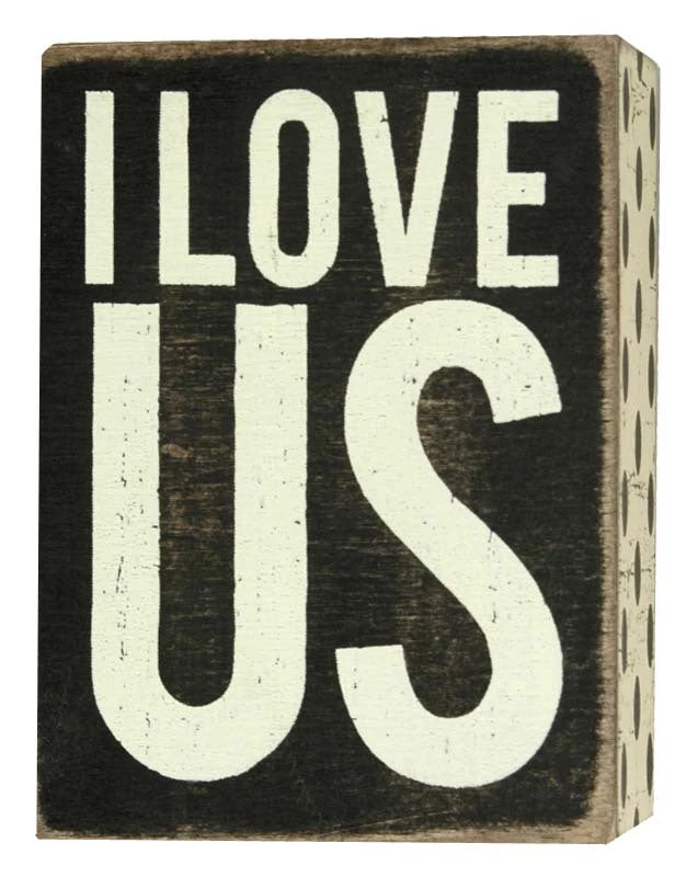 A classic black and white wooden box sign featuring a distressed “I Love Us” sentiment with polka dot trim designs. Easy to hang or can free-stand alone. 3″ x 4″