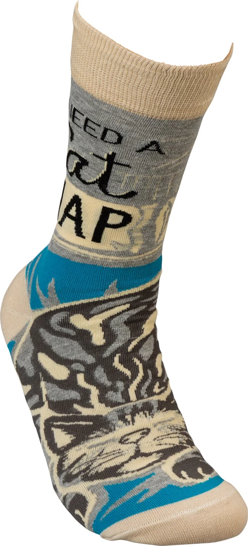 Colorfully printed socks lending an “I Need A Cat Nap” sentiment with bed and sleeping cat design. One size fits most. Cotton, nylon, spandex. One size fits most.