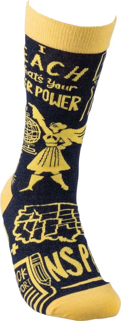 Colorfully printed socks lending “I Teach What’s Your Super Power” sentiment with superhero teacher and classroom imagery. One size fits most. Cotton, nylon, spandex.