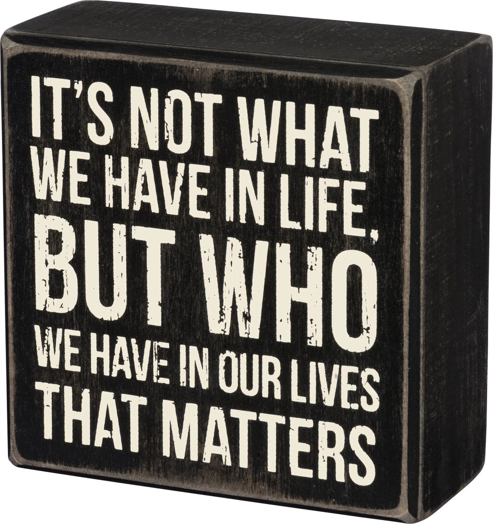 Classic and timeless, a black and white wooden box sign featuring a distressed “It’s Not What We Have in Life, But Who We Have in Our Lives That Matters” sentiment. Easy to hang or can free-stand alone. 4″