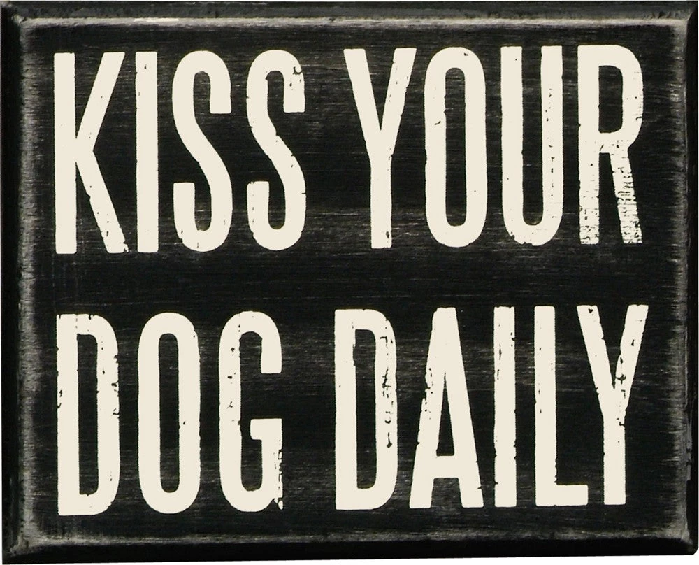 A classic black and white wooden box sign featuring a distressed “Kiss Your Dog Daily” sentiment. Easy to hang or can free-stand alone. 5″ x 4″ x 1.75″