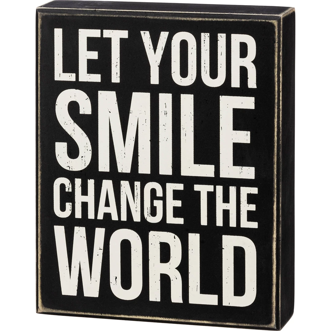 A classic black and white wooden box sign featuring a distressed “Let Your Smile Change The World” sentiment. Easy to hang or can free-stand alone.