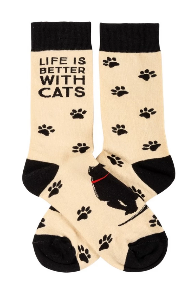 Colorfully printed socks lending a “Life Is Better With A Cats” sentiment with pawprint and cat designs. Cotton, nylon, and spandex blend. Machine-washable. One size fits most.